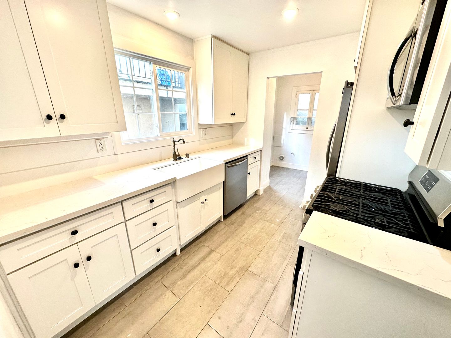 This spacious 3-bedroom, 2-bathroom residence features hardwood floors throughout and a tile-floored kitchen designed for both style and function. The large kitchen includes a breakfast area, ample cabinetry, and modern appliances—refrigerator, gas range, dishwasher, and microwave—making it ideal for everyday living and entertaining.